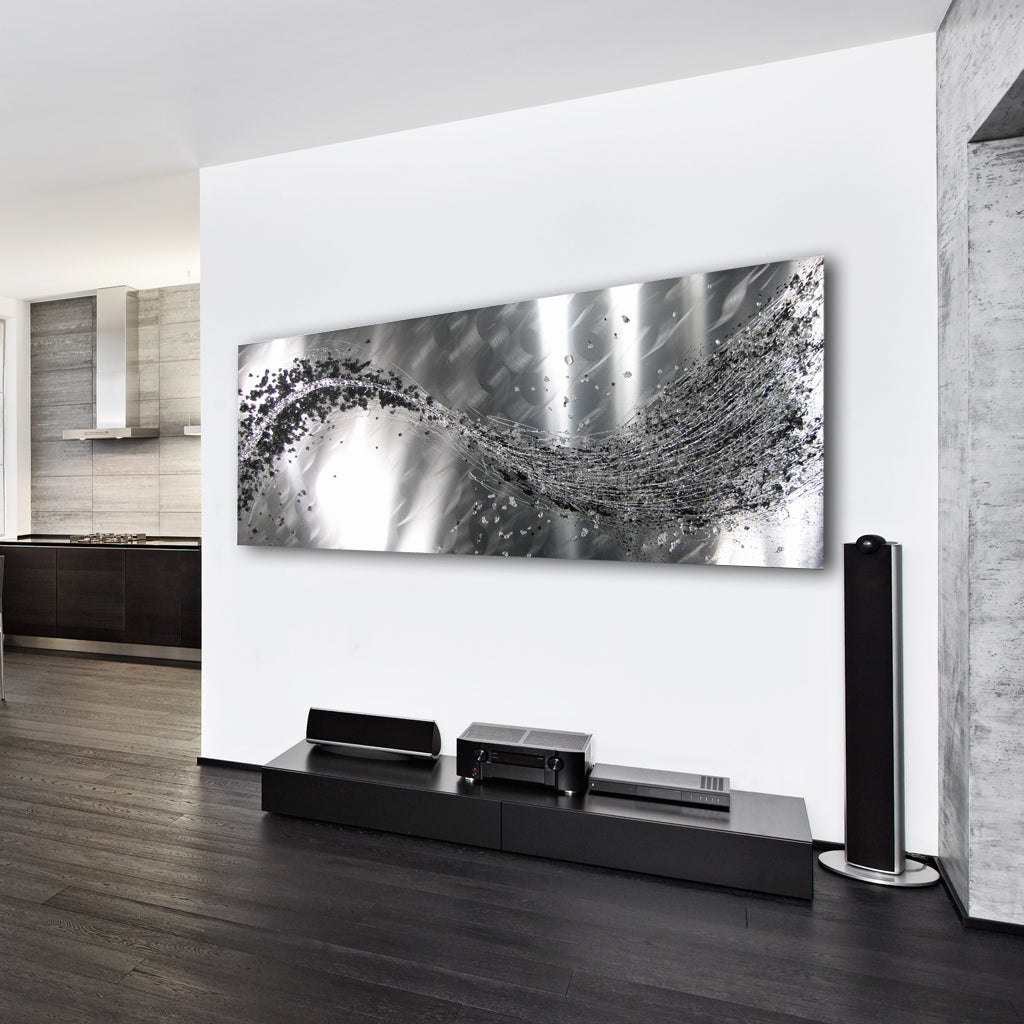 The central artwork pops with the high gloss, Italian silver frame, which is set onto 6mm grey tinted, bevelled mirror. This is then floated 15mm from your wall with secure spacing bracket system.