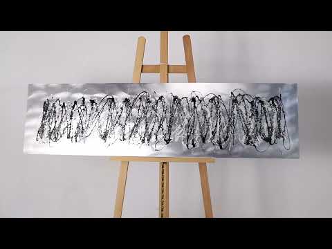 This original metal wall art is created on an aluminium base, which is worked by hand to create subtle patterns that will become unique with the lighting of your room. Next, black and white liquid resins are drizzled over crushed, recycled glass, producing this flowing design.